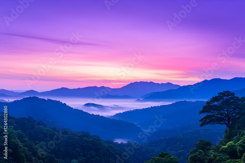 Obraz premium Serene misty sunrise over rolling green hills, shrouded in fog. Nature stock...
