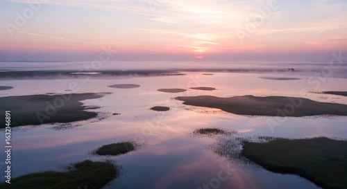 © Xioo, Fototapeta premium Serene Misty Wetlands at Sunrise with Pastel Sky and Reflective Waters.