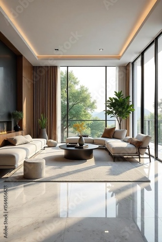 Fototapeta premium Serene Modern Living Room Sleek Marble, Minimalist Design, Abundant Natural...
