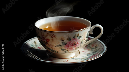 Obraz premium Serene Moment - Hand-Painted Ceramic Teacup with Floral Patterns and Steaming Tea on Saucer