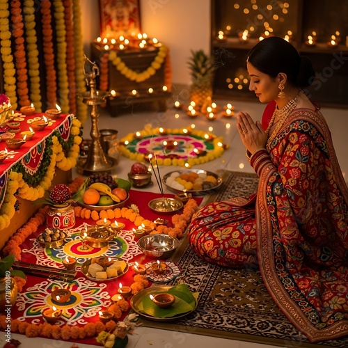 Fototapeta premium Serene moment of an Indian woman in a traditional saree performing a Laxmi Puja during the auspicious Diwali festival celebration at home