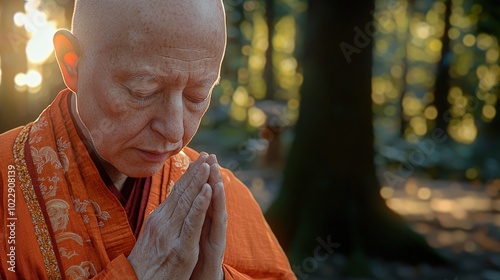 © BonzEarthsnapper, Fototapeta premium Serene Monk in Nature: A Close-Up Portrait
