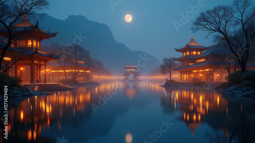 © Narong, Fototapeta premium Serene Moonlit Chinese Temples - Night photography