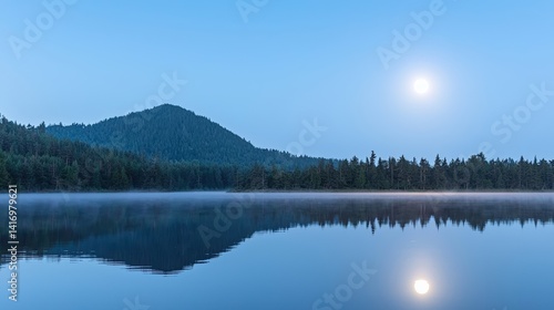 © Preecha, Fototapeta premium Serene Moonlit Lake & Mountain Reflection - Nature Photography