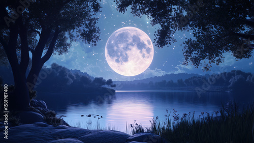 Naklejka premium Serene moonlit landscape reflecting on calm lake surrounded by trees and stars.