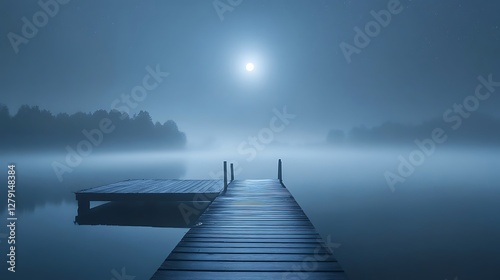 © Tcukimay, Naklejka premium Serene moonlit night scene with a wooden dock extending into a misty lake.