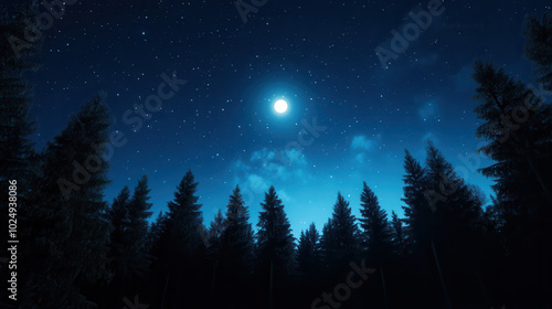 © MP-AI, Fototapeta premium serene moonlit night sky filled with stars over forest