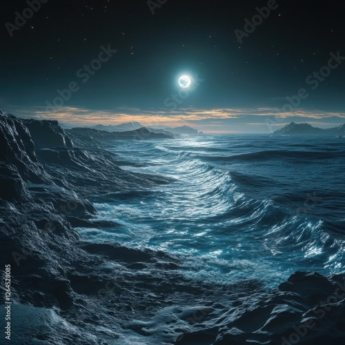 © tanawatbig, Fototapeta premium Serene Moonlit Ocean Waves Crashing Against Rocky Shoreline at Night