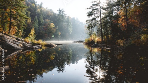 Naklejka premium Serene morning at a tranquil lake surrounded by vibrant autumn foliage