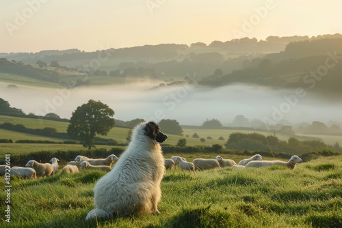 © spyrakot, Naklejka premium Serene Morning in Meadow with Sheepdog Watching Over Flock, Fog Rolling Over Hills - Perfect for Nature Posters and Wall Art