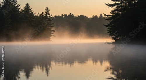 Fototapeta premium Serene morning lake with mist and reflections creating a tranquil landscape...