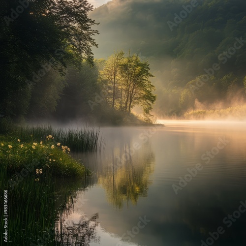 © Damerfie, Fototapeta premium Serene Morning Landscape with Misty Lake and Green Reflections