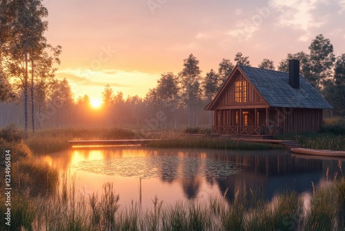 Fototapeta premium Serene morning light illuminates a rustic cabin by a tranquil pond