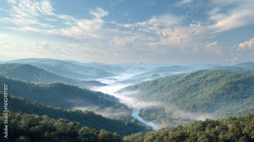 Fototapeta premium Serene morning light illuminates a winding river valley shrouded in light mist