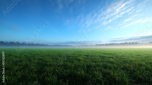 Fototapeta premium Serene Morning Meadow with Misty Blue Sky and Vast Green Grassland