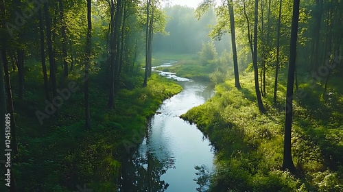 © Phan, Obraz premium Serene Morning Mist: A River Winding Through a Lush Forest AI Generated