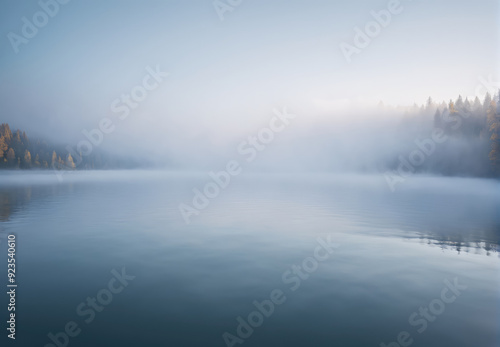 Fototapeta premium Serene Morning Mist Over Tranquil Lake Surrounded by Lush Forest in Autumn