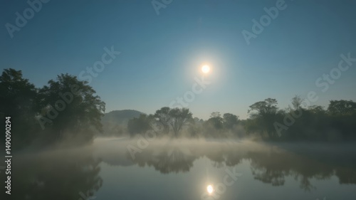 © Teepanun, Fototapeta premium Serene morning mist rises over a calm lake reflecting the sun and trees creating a peaceful and tranquil landscape scene.