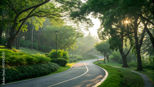 © Kanika Graphic, Fototapeta premium Serene Morning Pathway Through Lush Green Trees in Soft Light