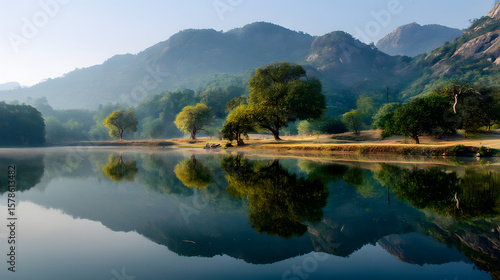 © abdullah, Fototapeta premium Serene Morning Reflection of Lush Green Trees and Misty Mountains on a Calm Lake Surface