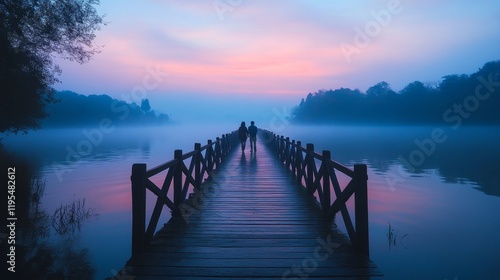 © Ryzhkov, Fototapeta premium Serene Morning Romance on a Misty Lake Bridge