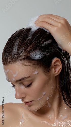 Naklejka premium Serene Morning Routine: Young Woman Washing Her Face with Radiant Skin