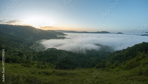 Naklejka premium Serene morning scene of lush grassy hills and fog-filled expansive valley...