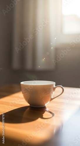 © MissBeauty, Fototapeta premium Serene morning sunlight illuminates an empty white teacup on a warm wood table.