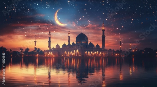 © medalinebow, Fototapeta premium Serene Mosque at Dusk Under Starry Sky and Crescent Moon