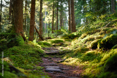 Fototapeta premium Serene moss-covered forest path bathed in soft sunlight surrounded by...