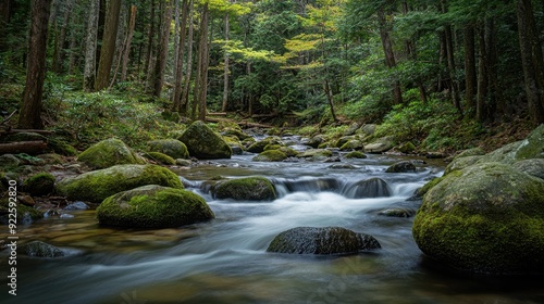 © Oksana Smyshliaeva, Obraz premium Serene Moss-Covered Rocks in Forest Stream