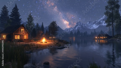 Fototapeta premium Serene mountain cabin by a lake at night
