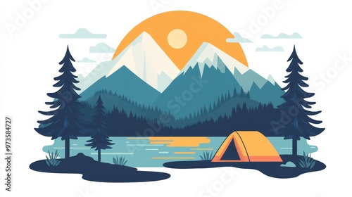 © Coffee Cafe Lover, Fototapeta premium Serene Mountain Camping Scene in Minimal Flat Design