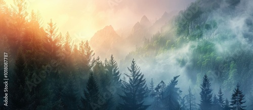 Naklejka premium Serene Mountain Forest with Mist and Sunset Sky in Enchanted Landscape
