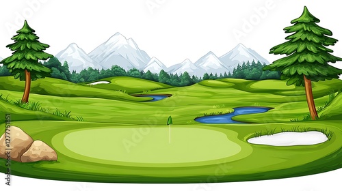 © NatthaphonSiri, Obraz premium Serene Mountain Golf Course Illustration.