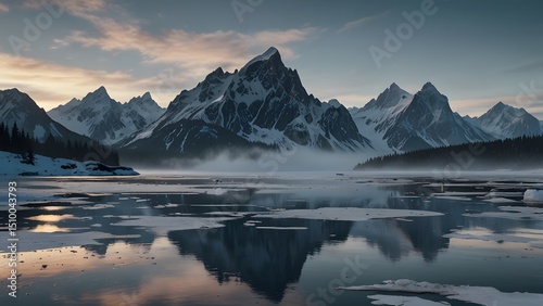 Obraz premium Serene Mountain Lake at Dawn Winter Landscape Snow capped Peaks Reflection