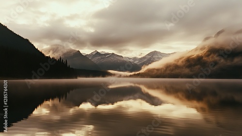 © Kenny, Obraz premium Serene mountain lake at dawn with mist and reflections in calm water