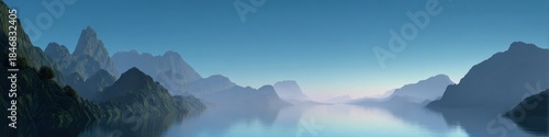 © Iryna, Obraz premium Serene mountain lake at dawn with misty horizons and reflections