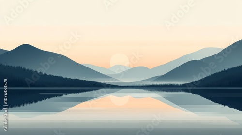 © Rouliiyy, Fototapeta premium Serene Mountain Lake at Sunset. Minimalist Flat Art.