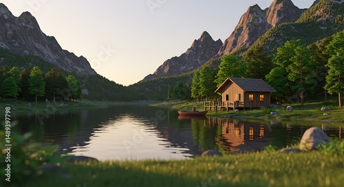 Fototapeta premium Serene Mountain Lake Cabin: A Tranquil Retreat