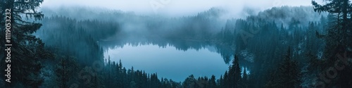 Fototapeta premium Serene Mountain Lake Enveloped by Misty Forest