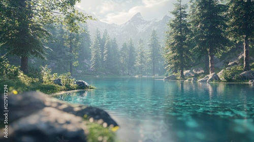 © jaargib, Naklejka premium Serene mountain lake in a lush forest.