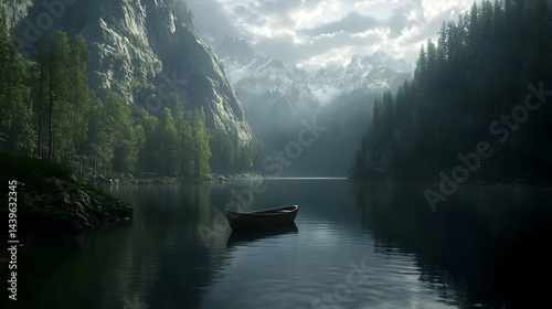 Fototapeta premium Serene Mountain Lake Landscape: A Peaceful Boat on Calm Waters