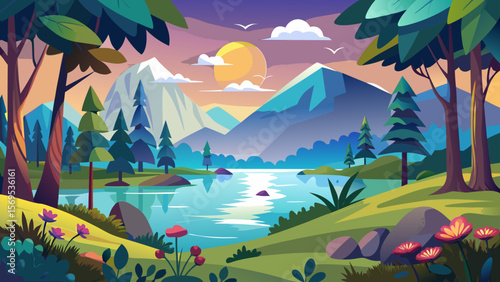 Fototapeta premium Serene mountain lake landscape at sunset with colorful sky and lush greenery