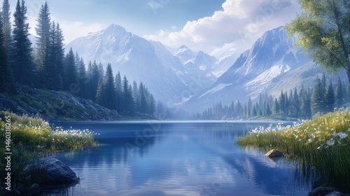 © Prism Trail, Fototapeta premium Serene mountain lake landscape reflecting a peaceful sky.