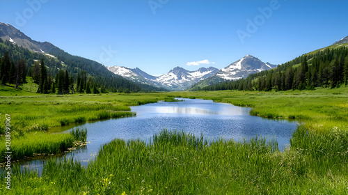 © Munanto, Fototapeta premium Serene Mountain Lake Landscape with Lush Green Meadow