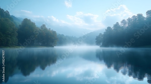 © siyons, Fototapeta premium Serene Mountain Lake Mist Shrouds Trees