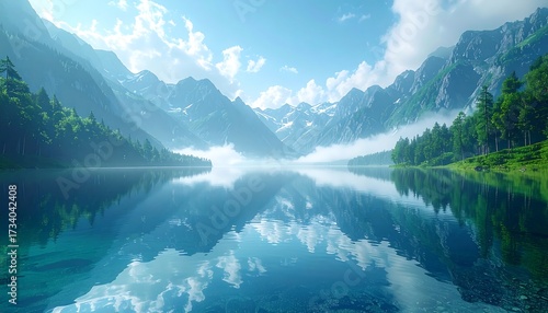 © Sajar, Fototapeta premium Serene mountain lake reflecting a sky filled with clouds and sunlit peaks