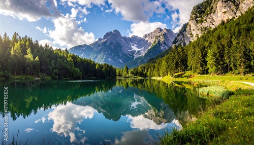© Wong, Fototapeta premium Serene mountain lake reflecting a sky of clouds