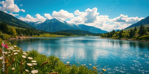 Obraz premium Serene mountain lake reflecting a vibrant sky, surrounded by lush greenery and wildflowers on a sunny day